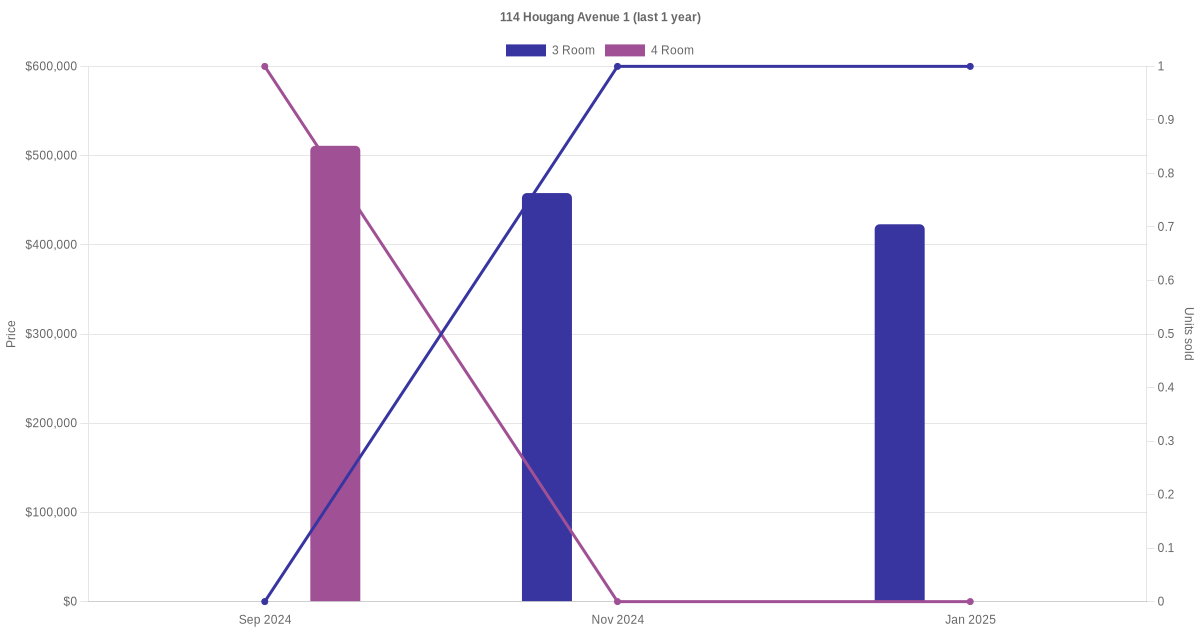 Below is a quick summary of the resale transactions volume and average price trends for the 3 room and 4 room units at 114 Hougang Avenue 1.