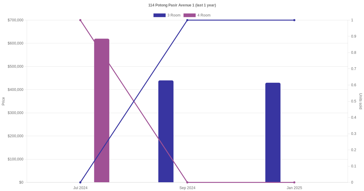 Below is a quick summary of the resale transactions volume and average price trends for the 3 room and 4 room units at 114 Potong Pasir Avenue 1.
