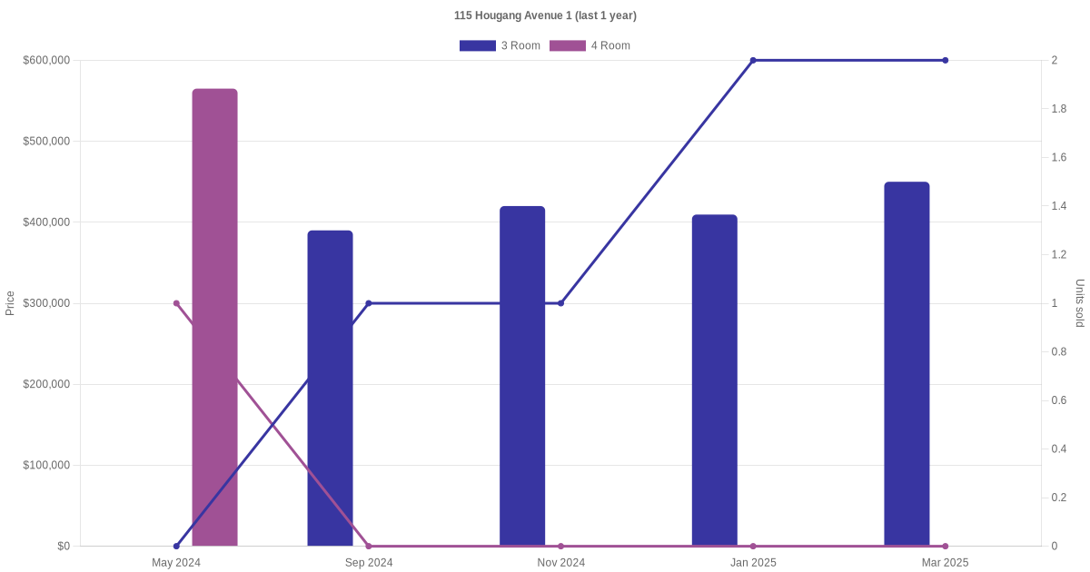 Here's a summary of the rental transactions and price trends for the 3 room, 4 room and 5 room units at 115 Hougang Avenue 1.