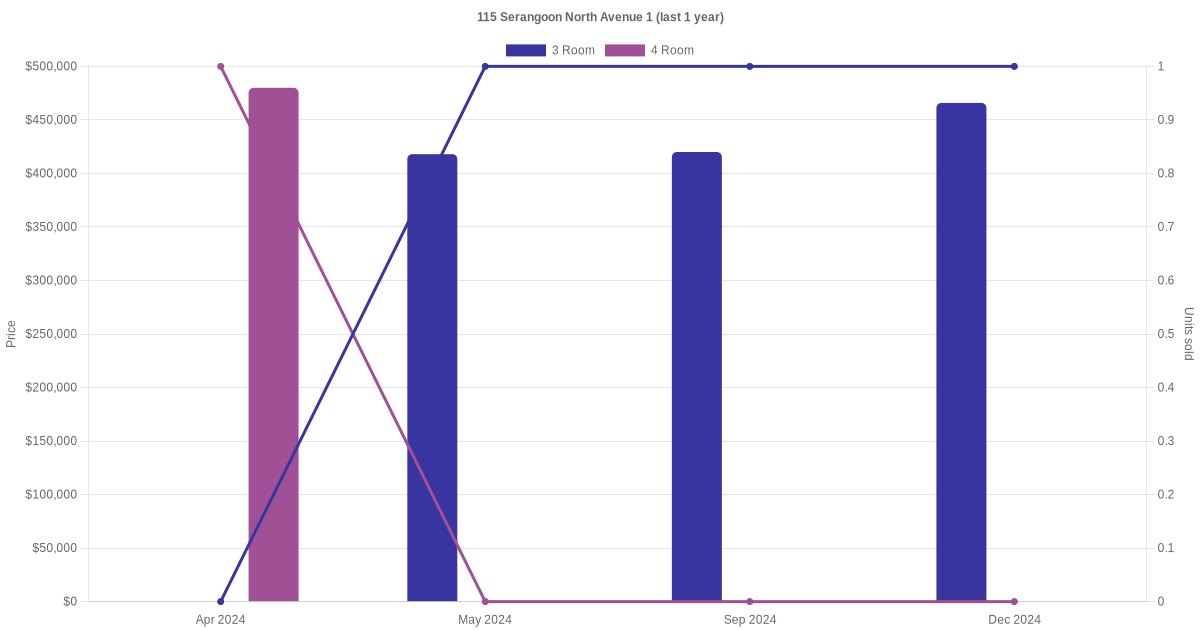 Below is a quick summary of the resale transactions volume and average price trends for the 3 room and 4 room units at 115 Serangoon North Avenue 1.