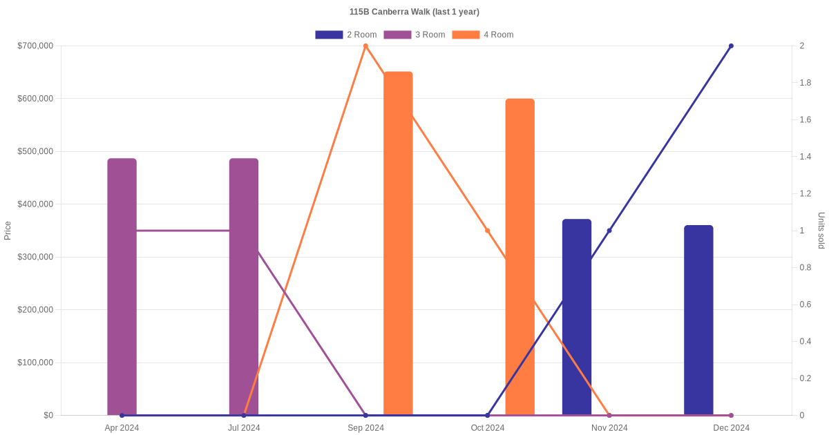 Here's a summary of the rental transactions and price trends for the 2 room, 3 room and 4 room units at 115B Canberra Walk.