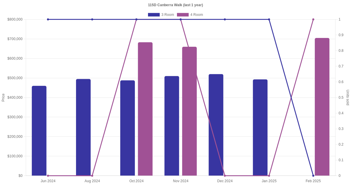 Below is a quick summary of the resale transactions volume and average price trends for the 3 room and 4 room units at 115D Canberra Walk.