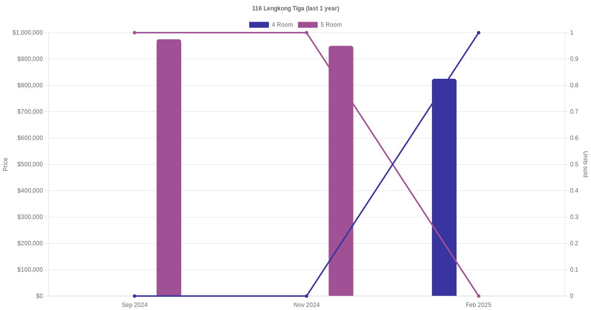 There were a total of 6 resale transactions in the last 3 years for units in block 116 Lengkong Tiga, with the latest one recorded in Feb 2025.