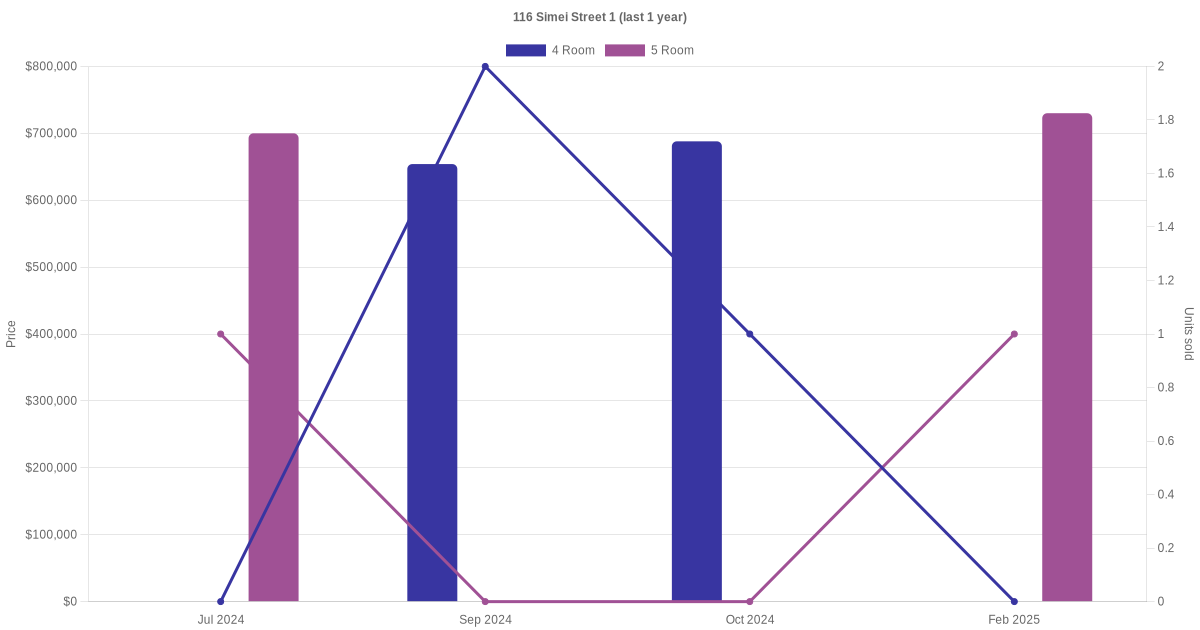 Below is a quick summary of the resale transactions volume and average price trends for the 4 room and 5 room units at 116 Simei Street 1.