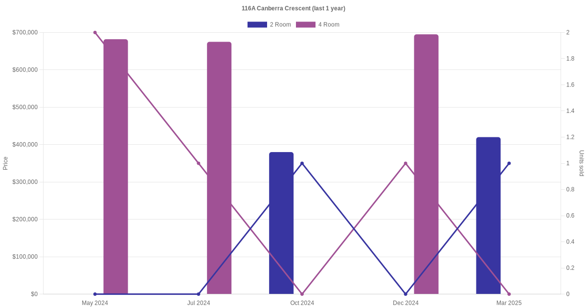 Here's a summary of the rental transactions and price trends for the 2 room, 3 room and 4 room units at 116A Canberra Crescent.
