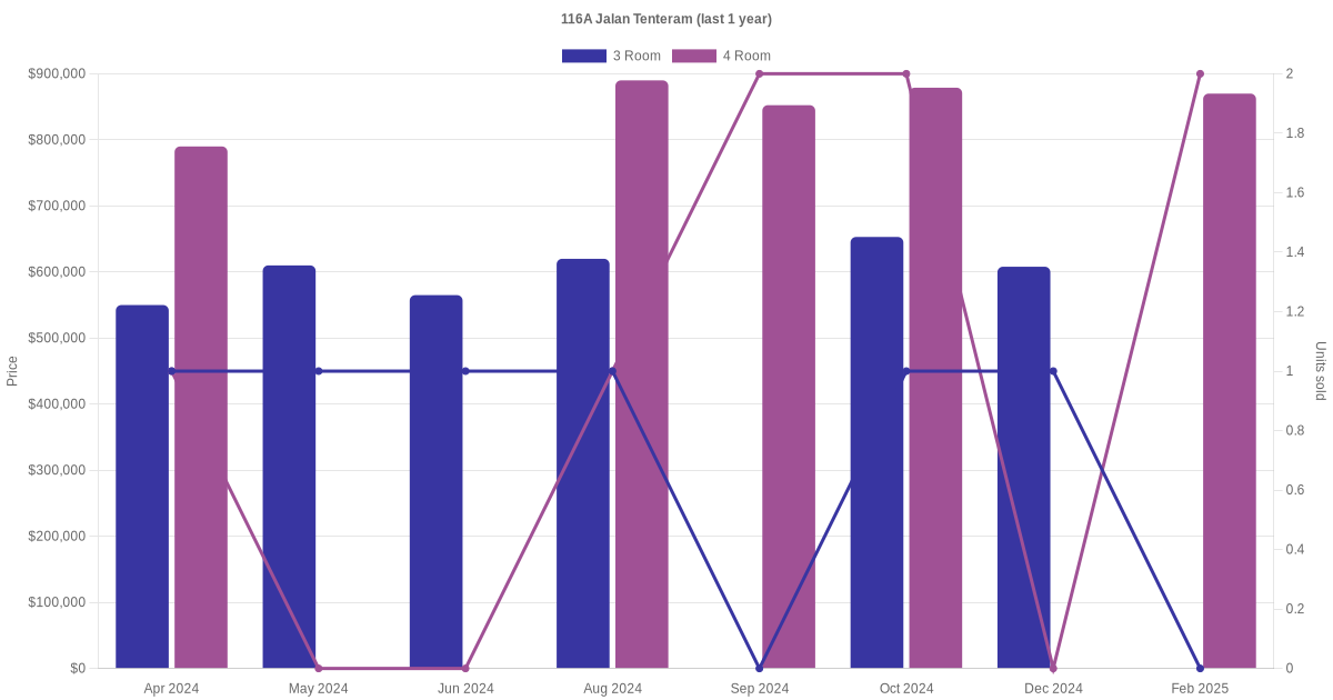 Below is a quick summary of the resale transactions volume and average price trends for the 3 room and 4 room units at 116A Jalan Tenteram.
