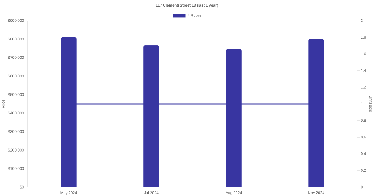 There were a total of 5 resale transactions in the last 3 years for units in block 117 Clementi Street 13, with the latest one recorded in Nov 2024.