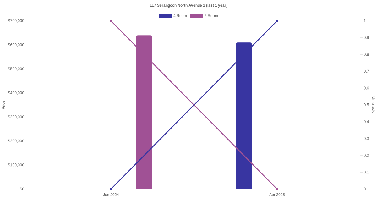 Below is a quick summary of the resale transactions volume and average price trends for the 4 room and 5 room units at 117 Serangoon North Avenue 1.