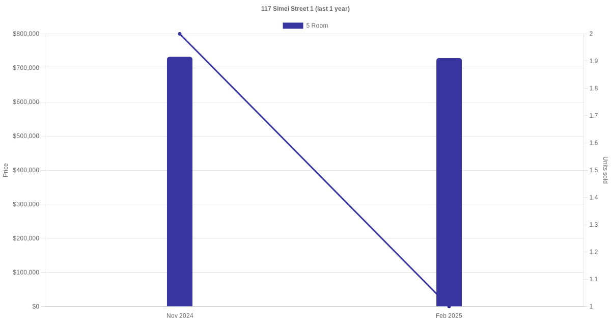Below is a quick summary of the resale transactions volume and average price trends for the 4 room and 5 room units at 117 Simei Street 1.