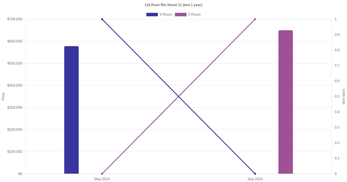 Below is a quick summary of the resale transactions volume and average price trends for the 4 room and 5 room units at 118 Pasir Ris Street 11.