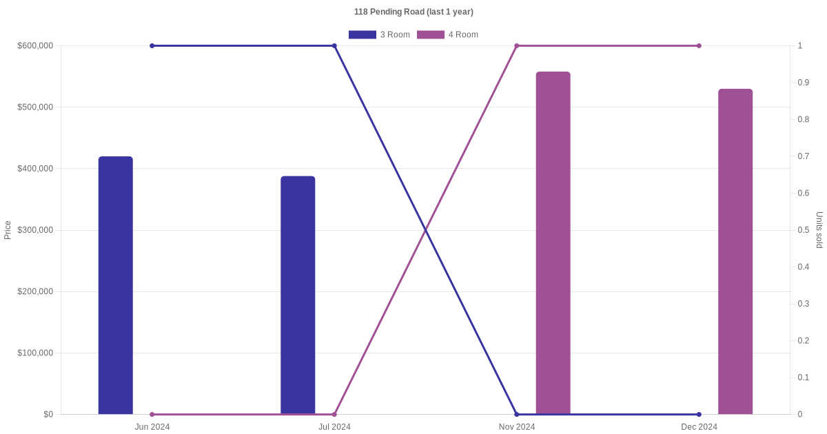 Below is a quick summary of the resale transactions volume and average price trends for the 3 room and 4 room units at 118 Pending Road.
