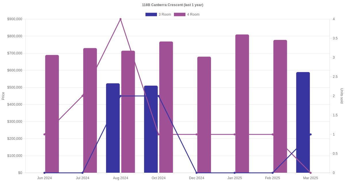Below is a quick summary of the resale transactions volume and average price trends for the 3 room and 4 room units at 118B Canberra Crescent.