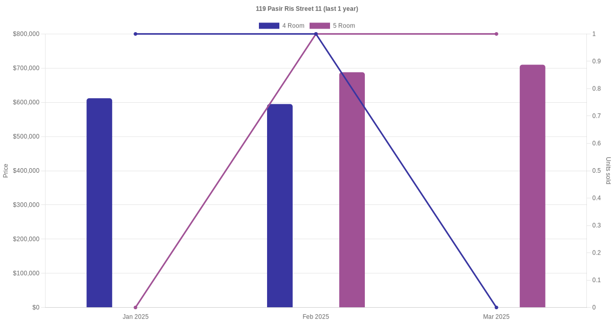 Below is a quick summary of the resale transactions volume and average price trends for the 4 room and 5 room units at 119 Pasir Ris Street 11.