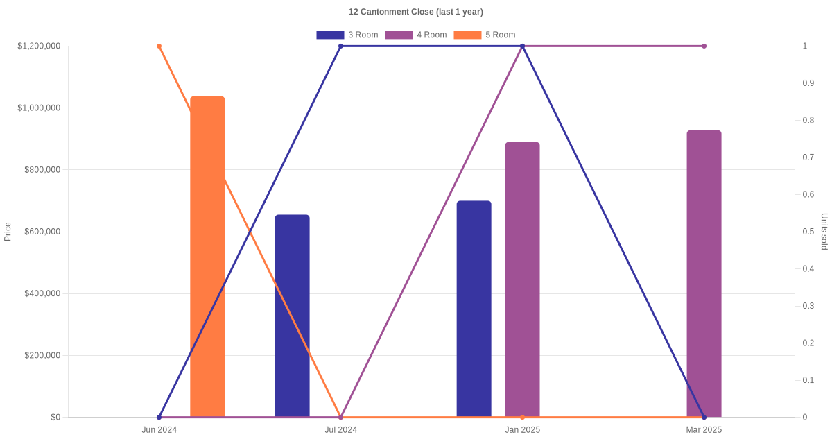 12 Cantonment Close is an HDB block located in Bukit Merah. It has 3 room, 4 room and 5 room units and the highest floor is 30. The block was completed in 2000 and the lease with HDB commenced in 2003. This means that the remaining lease period is approximately 84 years 11 months. The unit floor size are 60, 75, 90 and 110sqm. The latest resale transaction was in Jul 2025 and the highest transacted price was recorded in Jun 2024 for a 5 room unit at $1,038,000.