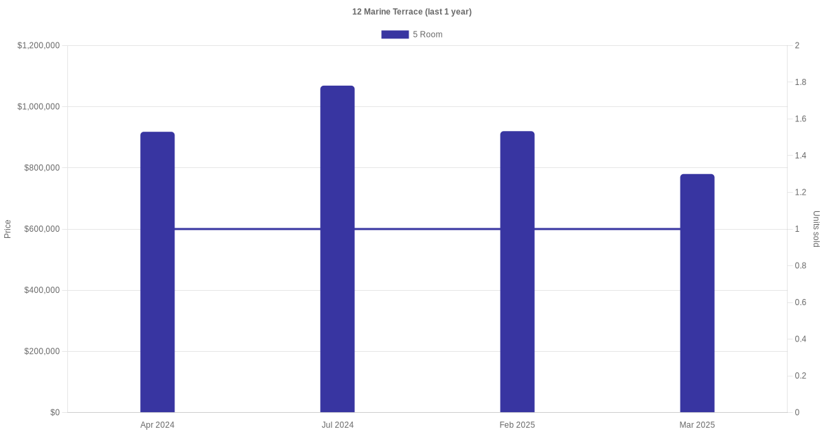 | Mar 2025 | $780,000 | $6,500 | 5 Room | Blk 12 Marine Terrace 5 Room / 120 sqm | 01 to 03 | 120 sqm | Standard | 1975 |