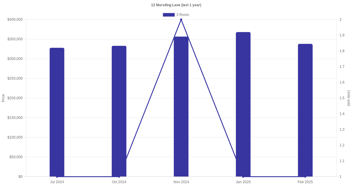 Below is a quick summary of the resale transactions volume and average price trends for the 3 room units at 12 Marsiling Lane.