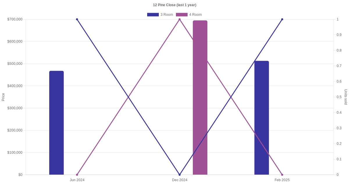 There were a total of 5 resale transactions in the last 3 years for units in block 12 Pine Close, with the latest one recorded in Apr 2025.