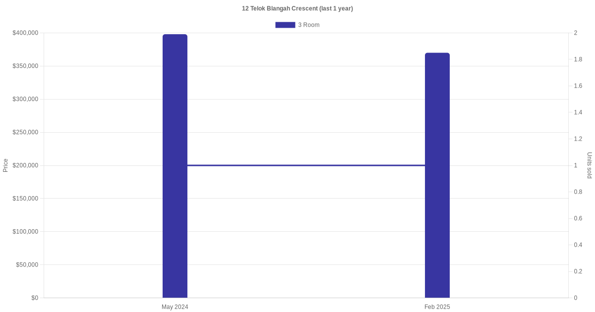Below is a quick summary of the resale transactions volume and average price trends for the 3 room units at 12 Telok Blangah Crescent.