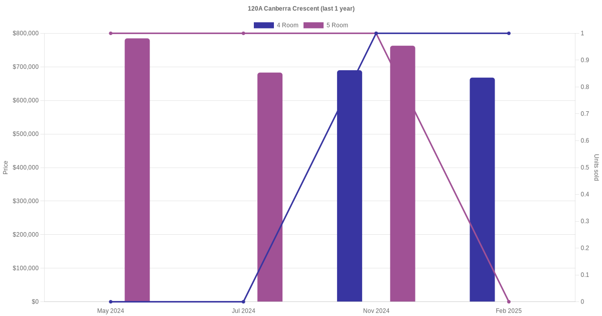 Below is a quick summary of the resale transactions volume and average price trends for the 4 room and 5 room units at 120A Canberra Crescent.
