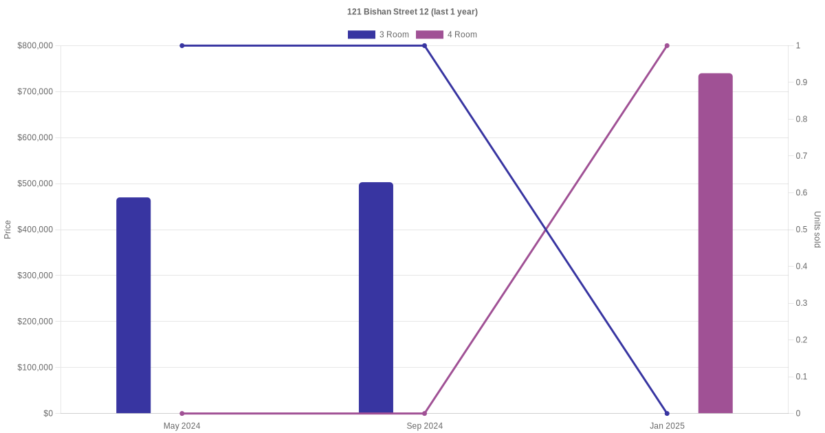 Below is a quick summary of the resale transactions volume and average price trends for the 3 room and 4 room units at 121 Bishan Street 12.