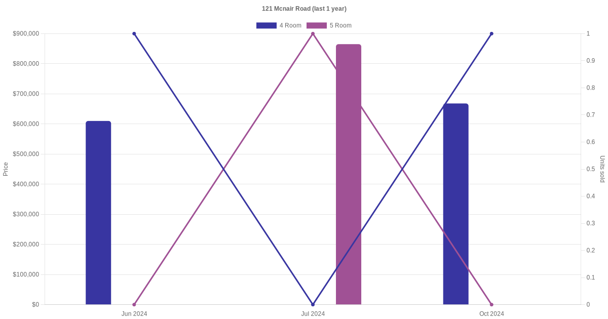 Below is a quick summary of the resale transactions volume and average price trends for the 4 room and 5 room units at 121 Mcnair Road.