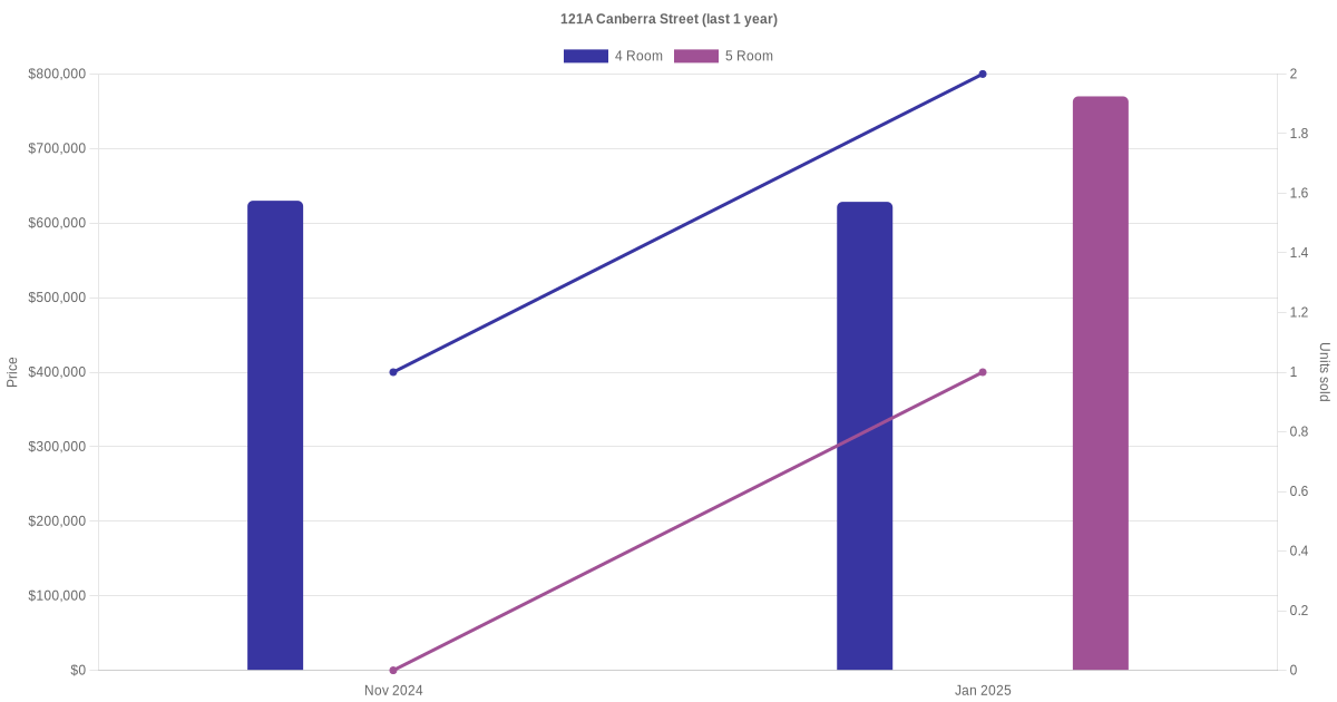 Below is a quick summary of the resale transactions volume and average price trends for the 4 room and 5 room units at 121A Canberra Street.