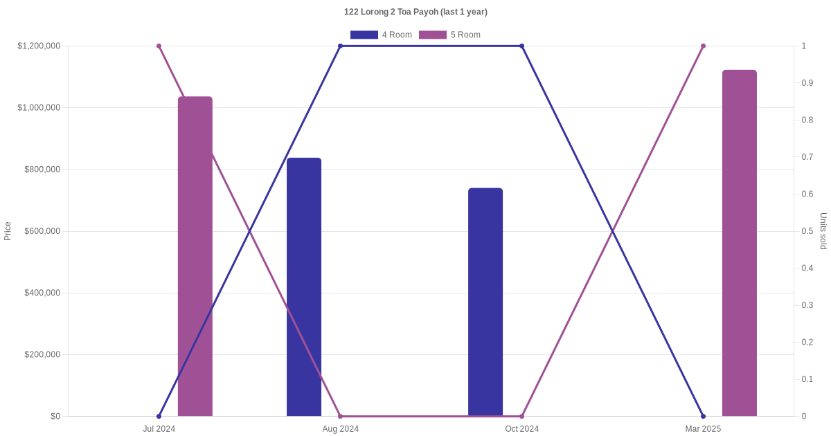 | Aug 2024 | $4,200 | 5 Room | Blk 122 Lorong 2 Toa Payoh 5 Room | Toa Payoh |