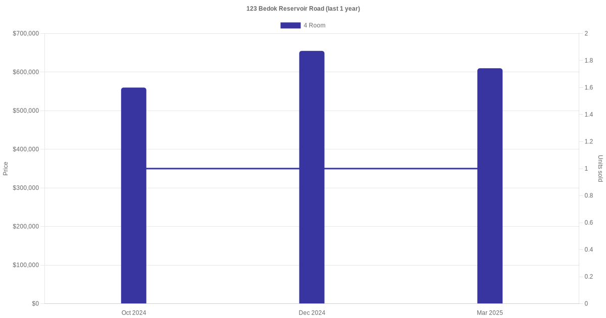 Below is a quick summary of the resale transactions volume and average price trends for the 4 room units at 123 Bedok Reservoir Road.