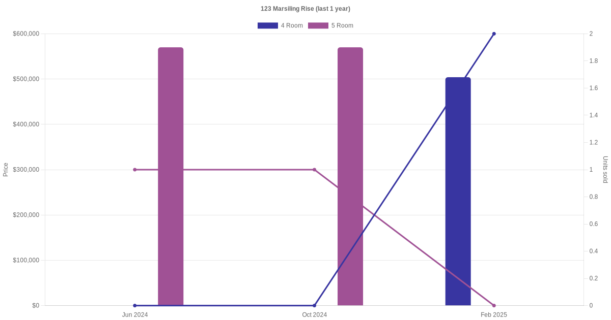 Below is a quick summary of the resale transactions volume and average price trends for the 4 room and 5 room units at 123 Marsiling Rise.