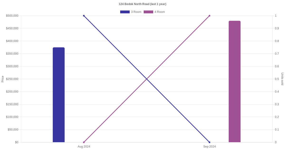 Below is a quick summary of the resale transactions volume and average price trends for the 3 room and 4 room units at 124 Bedok North Road.