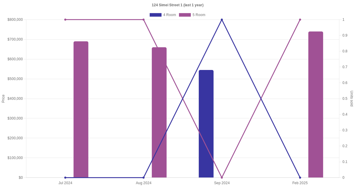 Below is a quick summary of the resale transactions volume and average price trends for the 4 room and 5 room units at 124 Simei Street 1.