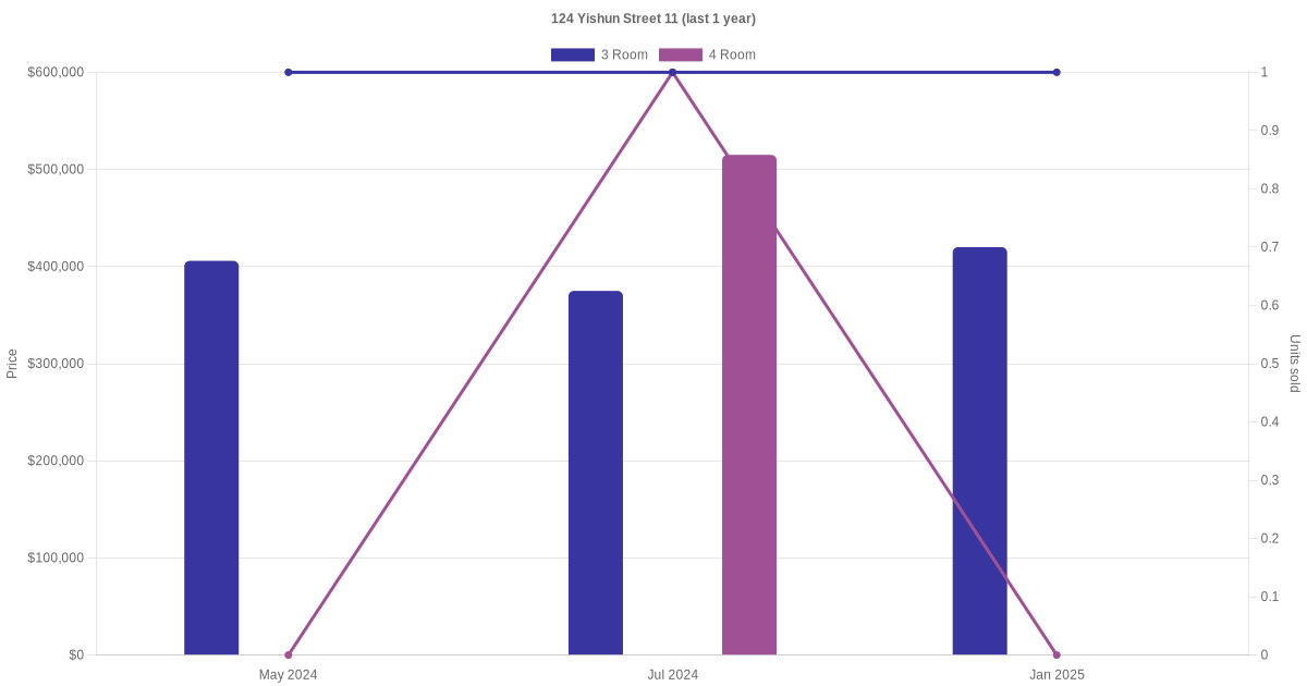 Below is a quick summary of the resale transactions volume and average price trends for the 3 room and 4 room units at 124 Yishun Street 11.