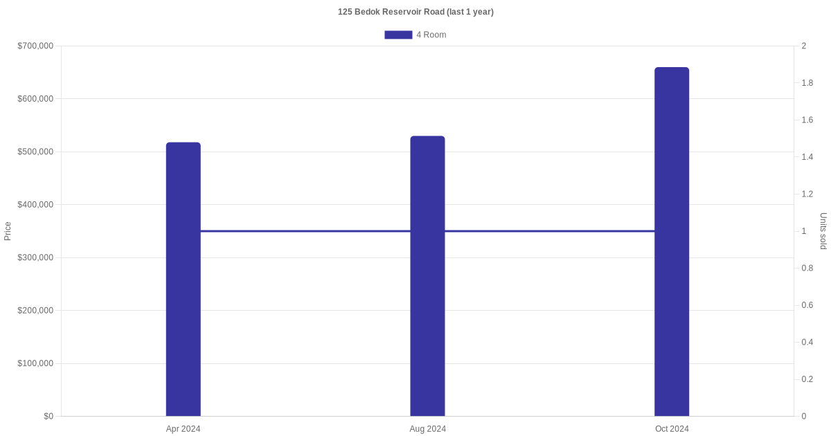 Below is a quick summary of the resale transactions volume and average price trends for the 4 room units at 125 Bedok Reservoir Road.