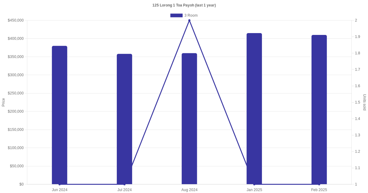 Below is a quick summary of the resale transactions volume and average price trends for the 3 room units at 125 Lorong 1 Toa Payoh.