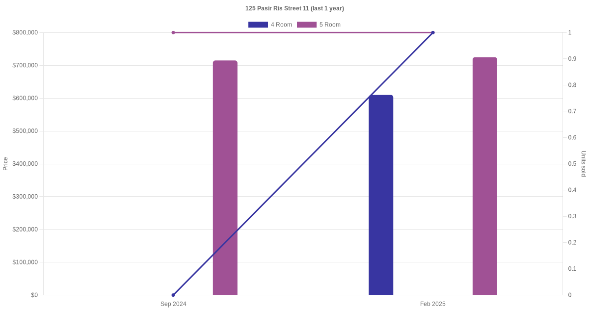 Below is a quick summary of the resale transactions volume and average price trends for the 4 room and 5 room units at 125 Pasir Ris Street 11.