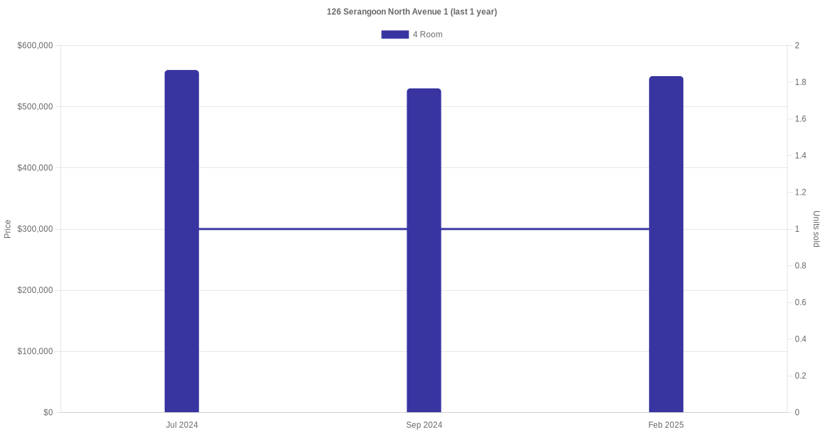 Below is a quick summary of the resale transactions volume and average price trends for the 4 room units at 126 Serangoon North Avenue 1.