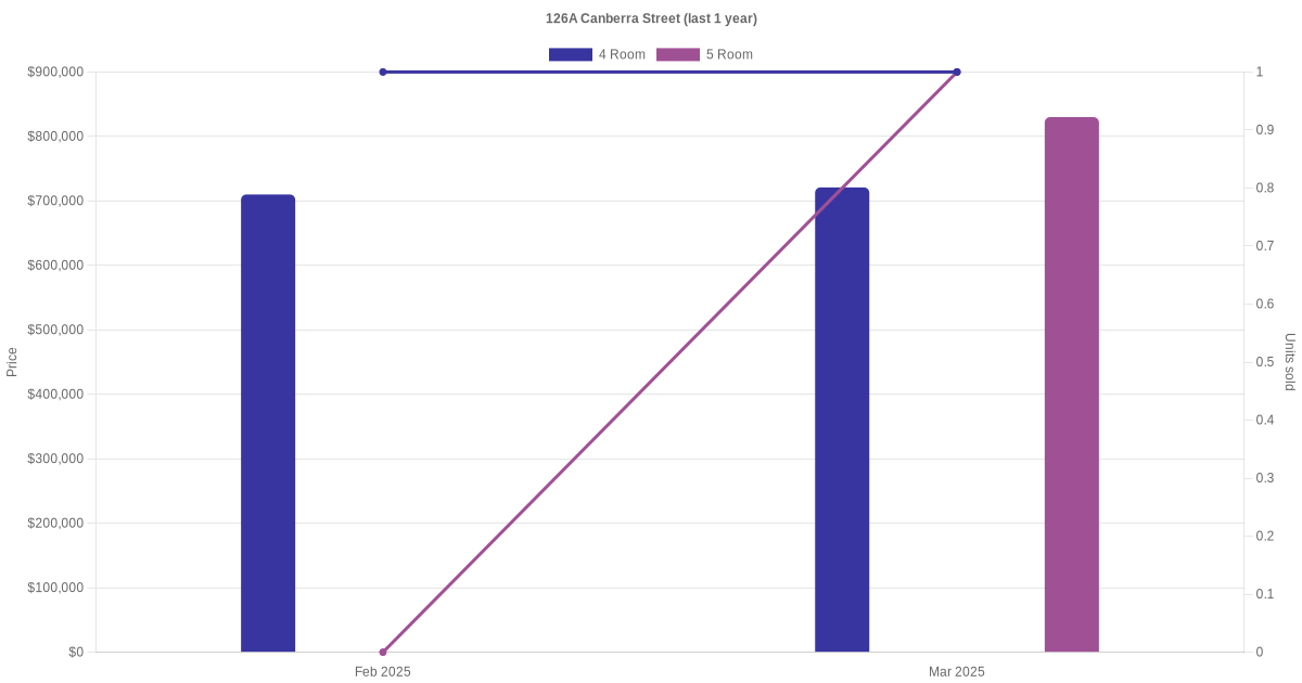 There were a total of 1 rental transactions in the last 3 years for units in block 126A Canberra Street. The latest recorded one was in Oct 2025.