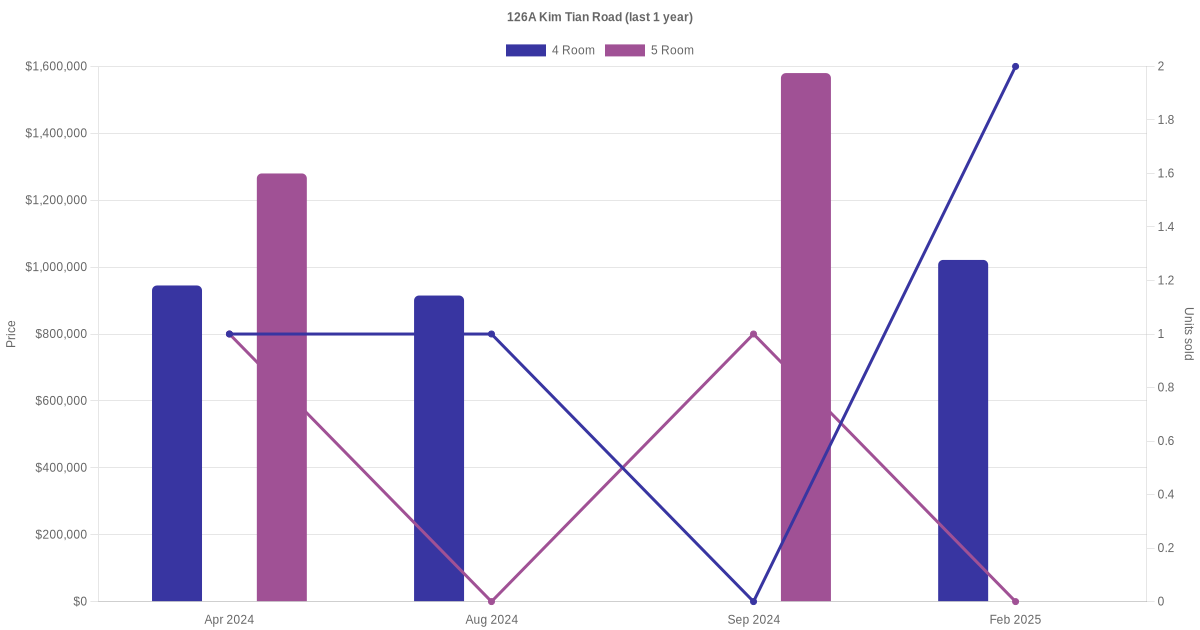 Below is a quick summary of the resale transactions volume and average price trends for the 4 room and 5 room units at 126A Kim Tian Road.