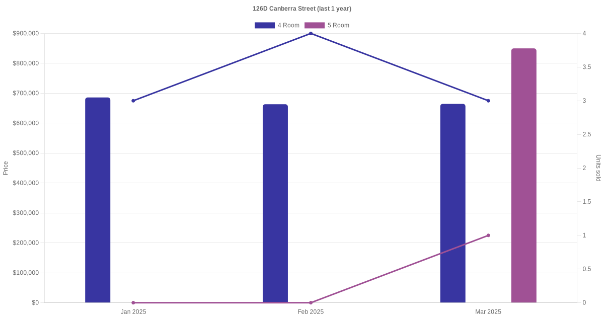 Below is a quick summary of the resale transactions volume and average price trends for the 4 room and 5 room units at 126D Canberra Street.