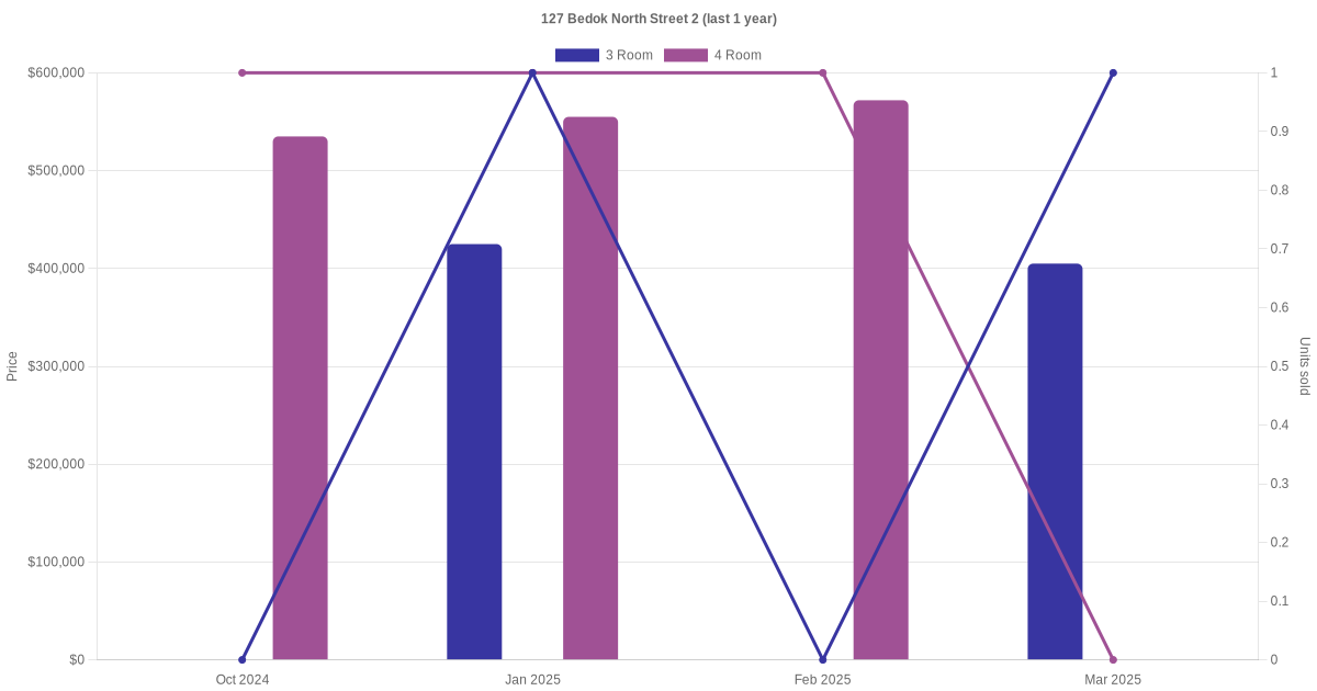 Below is a quick summary of the resale transactions volume and average price trends for the 3 room and 4 room units at 127 Bedok North Street 2.