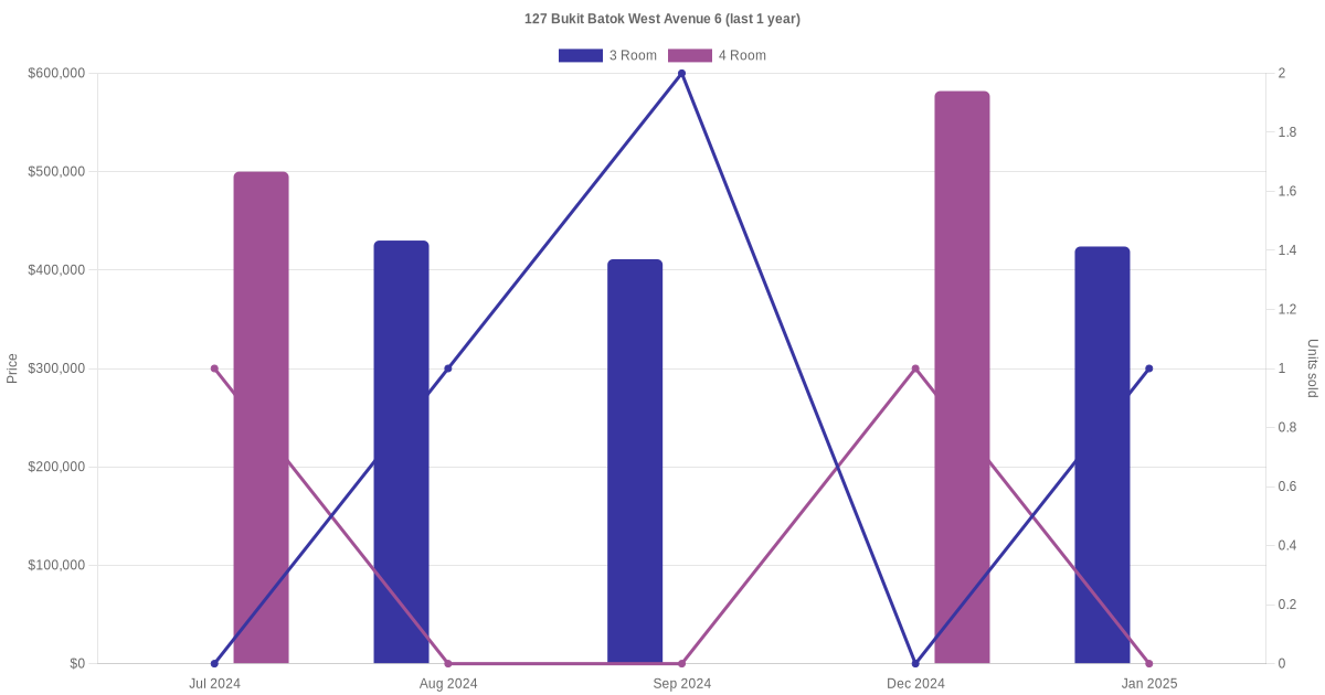Below is a quick summary of the resale transactions volume and average price trends for the 3 room and 4 room units at 127 Bukit Batok West Avenue 6.