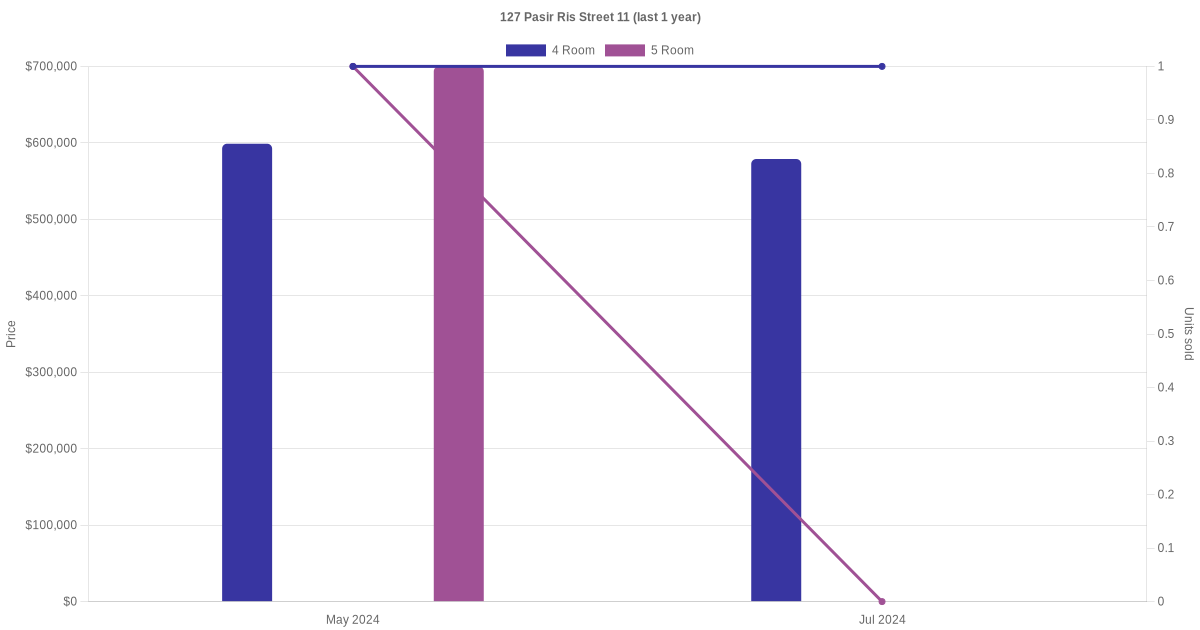 Below is a quick summary of the resale transactions volume and average price trends for the 4 room and 5 room units at 127 Pasir Ris Street 11.