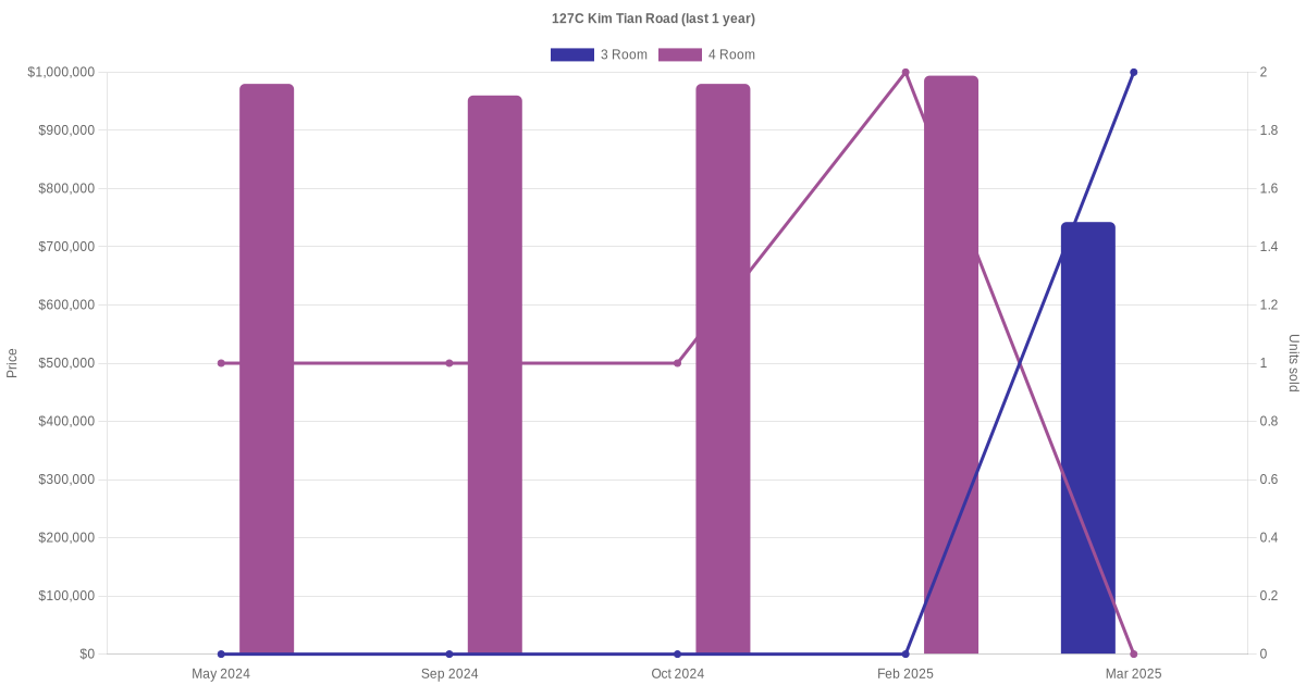 Below is a quick summary of the resale transactions volume and average price trends for the 2 room, 3 room and 4 room units at 127C Kim Tian Road.