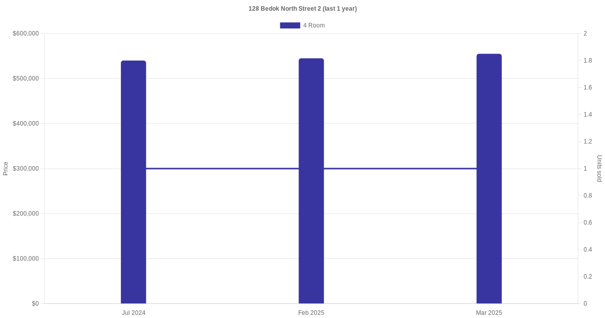 There were a total of 9 resale transactions in the last 3 years for units in block 128 Bedok North Street 2, with the latest one recorded in Dec 2025.
