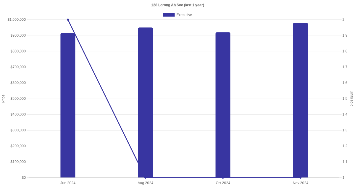 Below is a quick summary of the resale transactions volume and average price trends for the executive units at 128 Lorong Ah Soo.