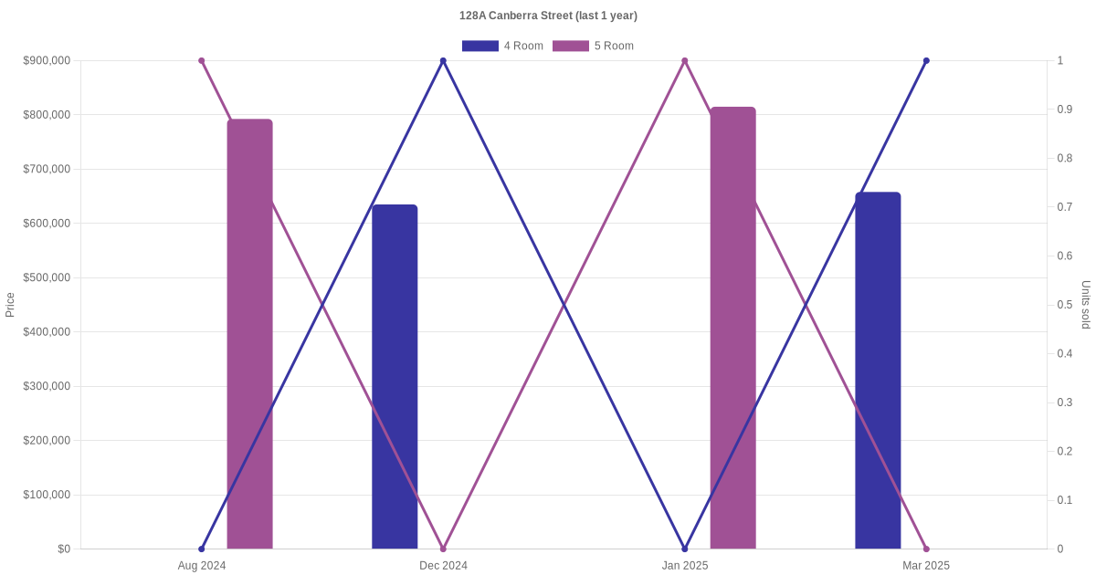 Below is a quick summary of the resale transactions volume and average price trends for the 4 room and 5 room units at 128A Canberra Street.