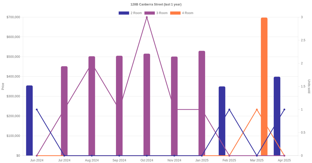 Here's a summary of the rental transactions and price trends for the 2 room, 3 room and 4 room units at 128B Canberra Street.