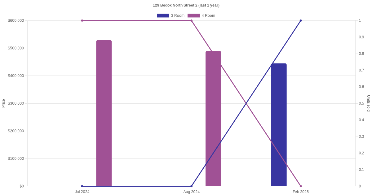 Below is a quick summary of the resale transactions volume and average price trends for the 3 room and 4 room units at 129 Bedok North Street 2.