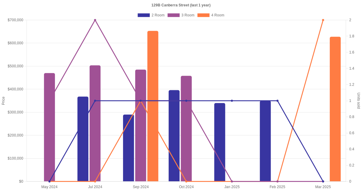Here's a summary of the rental transactions and price trends for the 2 room, 3 room and 4 room units at 129B Canberra Street.