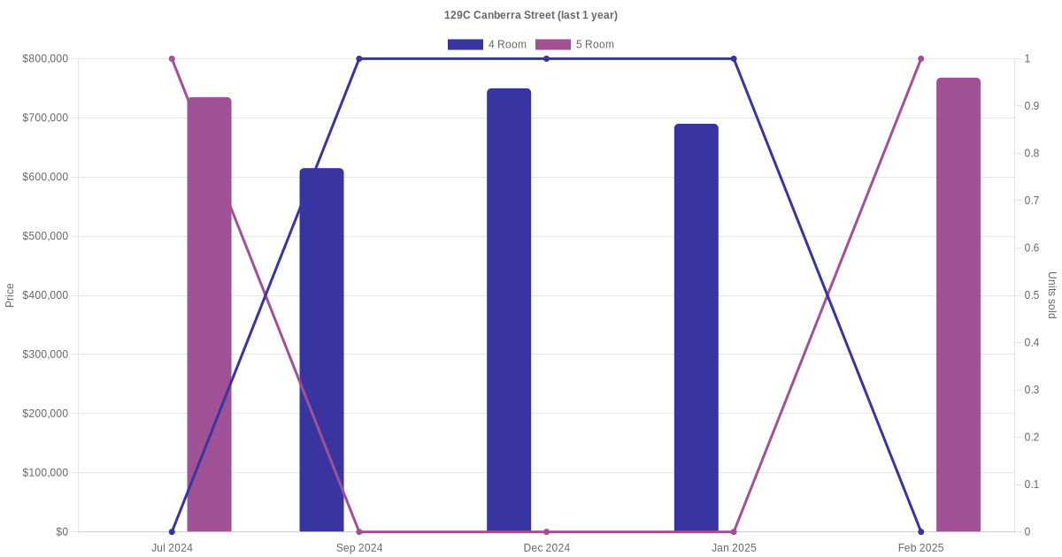 Below is a quick summary of the resale transactions volume and average price trends for the 4 room and 5 room units at 129C Canberra Street.